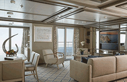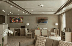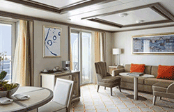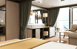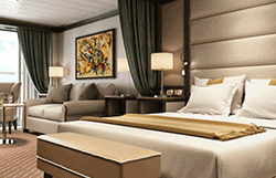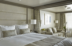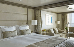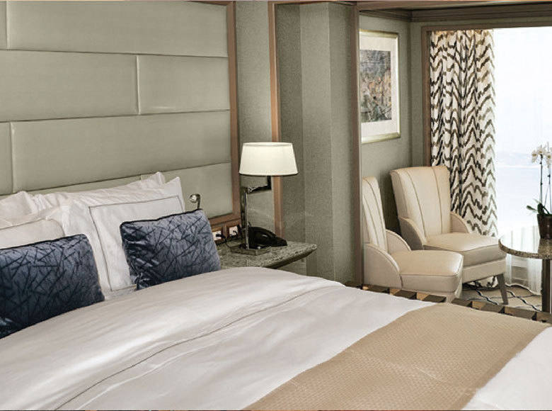 Step onto your terrace and bask in the calm feeling of the ocean breeze. Dissolve into the comfort of your king size bed. Prepare for the evening in the beautiful marble bathroom. The upper deck location gives the most spectacular of sea views, the spacious living area allows for comfortable relaxing where cosy nights in become veritable experiences in themselves. The two-bedroom configuration of this suite makes this it the ideal option for families.Dedicated butlerTwin beds or king-sized bedDown duvetsPremium mattressesPillow menuMarbled bathroom with double vanity, separate shower and full-sized bath, plus a powder room; Two-bedroom has additional marbled bathroom with full-sized bathEtro® bath robesBVLGARI® bath amenities, plus a choice of other European BrandsSlippersVanity table with hair dryerWalk-in wardrobe with personal safeSeparate dining areaRefrigerator and bar setup stocked with your preferencesTeak veranda with patio furniture and floor-to-ceiling glass doorIlly® Espresso MachineUnlimited Premium WifiBose Sound Touch 30 with Bluetooth connectivityInteractive Media LibraryTwo 55" / 140 cm flat-screen HD TVs in main suite, plus two 42" / 106 cm flat-screen HD TVs in bedroom two (if adjoined with second suite)iHome Radio / Alarm charging station (with USB cable or Qi wireless charging), NFC Bluetooth connectivityWall mounted USB-C mobile device chargersPersonalized stationary and umbrellaWet cleaning and pressing throughout the voyageLaundry service throughout the voyageSpecial chocolate welcomeAfternoon canapés upon requestDinner at officer’s table
