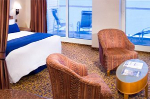Two twin beds (can convert into queen-size), sitting area (some with sofa bed), private balcony, mini bar, private bathroom, vanity area, hair-dryer, closed-circuit TV and phone. Rates vary from deck to deck. Also referred to as Deluxe Ocean View Stateroom with Balcony. (204 sq. ft., balcony 41 sq. ft.)
